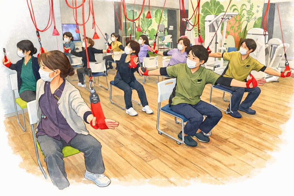・レッドコードを使ったストレッチ、筋力トレーニング