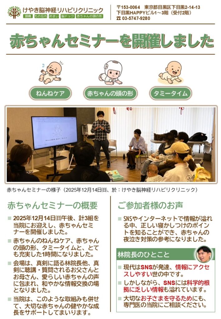 2025年12月14日(日)、夜泣き改善アプリLullabyの小嶋真子先生と一緒に、「あかちゃんまるっとケアDAY」セミナーを実施しました。当日は3組の親子の方にお越しいただきました。頭のかたちについて悩まれる方や、寝かしつけに悩まれる方にとって、少しでもお役に立てたらなによりです。