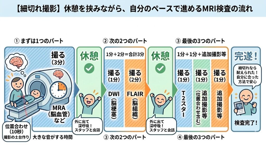 MRIは「10分間ずっとトンネル内で耐えなければならない」と思われがちですが、実際の中身は「数十秒〜数分の短い撮影」の詰め合わせです。